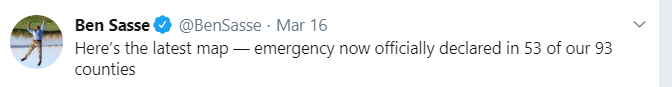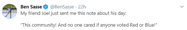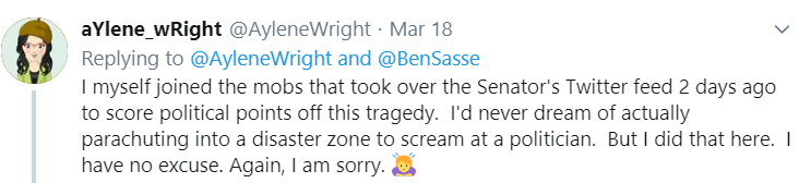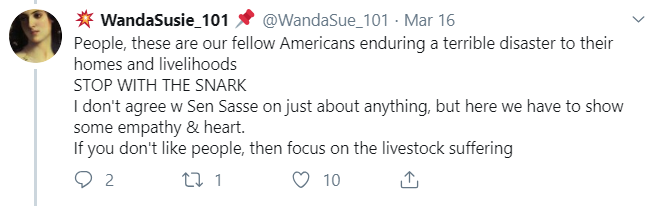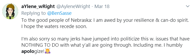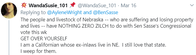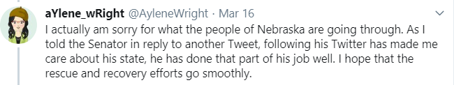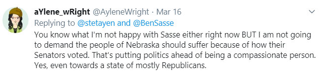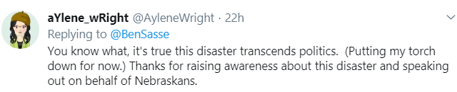 But then … I came across a reply to a Tweet about the loss of a bridge. I wound up blocking the person so I don’t have a screenshot, but it essentially said he didn’t care about what Nebraska and didn’t want a dime of HIS hard earned money to go to rebuilding the bridge, because, the poster claimed, Sasse hadn’t supported enough disaster relief for Puerto Rico.
