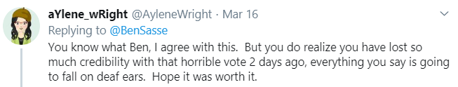 Now, from following Sasse’s Twitter I know he reads at least some of his replies. So when he posted this quote from a friend, it certainly seemed to indicate the dragging over his vote was starting to get to him …